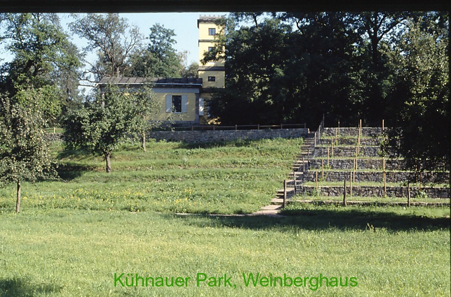 Nach dem II. Weltkrieg wurde der Kühnauer Park in der Pflege stark vernachlässigt. Die gärtnerischen Arbeiten erfolgten in erster Linie im Dessauer Georgium und in dem schon immer in der Besuchergunst weit vorn liegenden Wörlitzer Park . Der Kühnauer Park bot indes lange Zeit ein eher wüstes Bild. Von der Schönheit des Parks, wie wir Großkühnauer Schulkinder sie im Heimatkundeunterricht gelehrt und vorgestellt bekamen, war nicht mehr viel zu sehen. Der Auenwald eroberte sein Territorium zurück. Sichtachsen zum See und zur Großkühnauer Kirche waren zugewachsen, Wege teilweise nicht mehr erkennbar, Tore und Plastiken mehr oder weniger stark beschädigt. Ein deutlicher Wandel vollzog sich erst nach der politschen Wende, in deren Folge ab 1990 eine umfassende Sanierung des Parks möglich wurde. Kirche und Schloß konnten nunmehr restauriert werden, ebenso das von Carlo Ignazio Pozzi in den Jahren 1819 bis 1820 errichtete Weinberghaus und die davor befindlichen Terrassen auf denen wieder alte Rebsorten wie Elbling, Weißer und Roter Gutedel, Traminer , Roter Portugieser u.a. angebaut werden. Von noch größerer Bedeutung war aber, daß mit der Herstellung der Sichtachsen und der Sanierung des zum Park gehörenden Kühnauer Sees mit seinen Inseln die alte Anlage wieder erkennbar wurde. Als typischer Auenpark wird er von geschlossenen Wäldern, weiträumigen Wiesen mit einzeln stehenden Eichen, den sog. Solitär-Eichen, und Wildobstbäumen geprägt. Zum See hin vermitteln Gehölzgruppen und Baumreihen. Exoten, darunter Weymouths-Kiefer (Pinus strobus), Virginischer Wacholder (Juniperus virginiana), Sumpfzypresse (Taxodium distichum) u.a. sind eher selten. Dafür bereichern Speierling (Sorbus domestica) und Wild - oder Holz-Birnen, im heimatlichen Sprachgebrauch der älteren Großkühnauer als "Buschbirnen" (Pyrus pyraster) bezeichnet, die Artenpalette und schaffen mit Streuobstanlagen, die sich an vielen Orten im und am Park sowie in der angrenzenden Aue befinden , überaus reizvolle , farbenfrohe Tupfer. Wie kein anderes Landschaftselement verkörpern Streuobstanlagen den Anspruch der Gestalter des Dessau-Wörlitzer Gartenreichs , "das Schöne mit dem Nützlichen" zu verbinden. Heute stehen diese im Frühjahr reich blühenden Bäume entlang von Alleen, Wegen und Dämmen oder als Auen-Plantage wieder in der Gunst der Erholungssuchenden. Die Pflege der hochstämmigen Bäume inmitten der Überschwemmungswiesen ist sehr aufwendig. Andererseits läßt der Auen-Garten, in Großkühnau in einer dorfnahen Gemarkung als "Anger" benannt, eine Beweidung, vorzugsweise mit Schafen, zu. Die alten Apfel- und Birnen-Sorten, darunter "Jakob Lebel", "Adersleber Kalvill", "Halberstädter Jungfernapfel", "Gravensteiner", "Goldparmäne", "Gute Graue" (Graue Sommerbutterbirne), "Gellerts Butterbirne", "Boscs Flaschenbirne" oder "Gute Luise" sind seit mehr als 100 Jahren oder noch früheren Datums auf dem Markt. Streuobstwiesen werden nur noch zu 10% bewirtschaftet. Sie sind damit außerordentlich gefährdet, was im Hinblick auf ihren ästhetischen Reiz und ökologischen Wert sehr bedauerlich ist. Noch schwerwiegender ist es aber, daß bedeutende Genressourcen verloren gehen. Alle Projekte , die dieses alte Kulturgut schützen, sind deshalb nicht hoch genug einzuschätzen und bedürfen unserer ganzen Aufmerksamkeit. In Großkühnau hatte man nach dem II. Weltkrieg schon Plantagen mit Spindel-Bäumen, oft auch Spindelbüsche genannt, angelegt. Hier ließen sich die kurzstämmigen Bäume auf schwachwüchsiger Unterlage einfacher pflegen und das Obst, ohne auf eine größere Leiter steigen zu müssen, pflücken. Dennoch blieben, wie im großelterlichen Anwesen des Autors, dem Gartenbaubetrieb Otto Junger, hochstämmige Anlagen mit dazwischen liegenden Wiesenflächen, heute nennen wir es Streuobstanlagen, bestehen. Der Spindelbaum-Anbau wurde zunächst noch wenig intensiv mit einer größeren Anzahl, heute schon weniger bekannter älterer Sorten betrieben, darunter "Charlamovsky", " Cox´ Orange", " Freiherr von Berlepsch", "Geheimrat Breuhahn", "Geheimrat Dr. Oldenburg", "James Grieve", "Schöner aus Nordhausen" oder "Zuccalmaglio". Eine damals in Baumschulen angebotene Sorte des russischen Züchters Mitschurin mit dem Namen " Kandil Kitaika" erwies sich als besonders frostbeständig. Die jungen Früchte dieser Sorte überstanden sogar schwerere Spätfröste. In der notvollen Zeit nach dem II. Weltkrieg baute man, das sei hier noch mitgeteilt, in den Spindelbaum-Anlagen zwischen den Baumreihen Gemüse an, um die Fläche optimal zu nutzen. Vergleiche zu Streuobstbeständen mit Wiesen- oder sogar Ackernutzung, wie in Großkühnau in Notzeiten angesagt, lassen sich hier durchaus herstellen. Auf einem Hochwasserschutz-Damm führt der Weg vom östlichen Teil des Kühnauer Parks zum Kornhaus. Carl Fieger, ein Lehrer im Bauhaus und von 1921 bis 1934 im Architekturbüro von Walter Gropius tätig, hat die Gaststätte vom Oktober 1929 bis zum Juni 1930 im Bauhaus-Stil erbaut. Der Name geht auf einen ehemaligen Getreidespeicher zurück, der sich bis 1871 in unmittelbarer Nähe befand. Das Kornhaus ist gemäß der Tradition des Bauhauses zweckbetont und funktionsbezogen konzipiert. Es integriert den Elbwall und fügt sich mit dem gelungenen Nebeneinander von runden und geraden Flächen - der charakteristischen Handschrift des Architekten - harmonisch in die Landschaft ein.