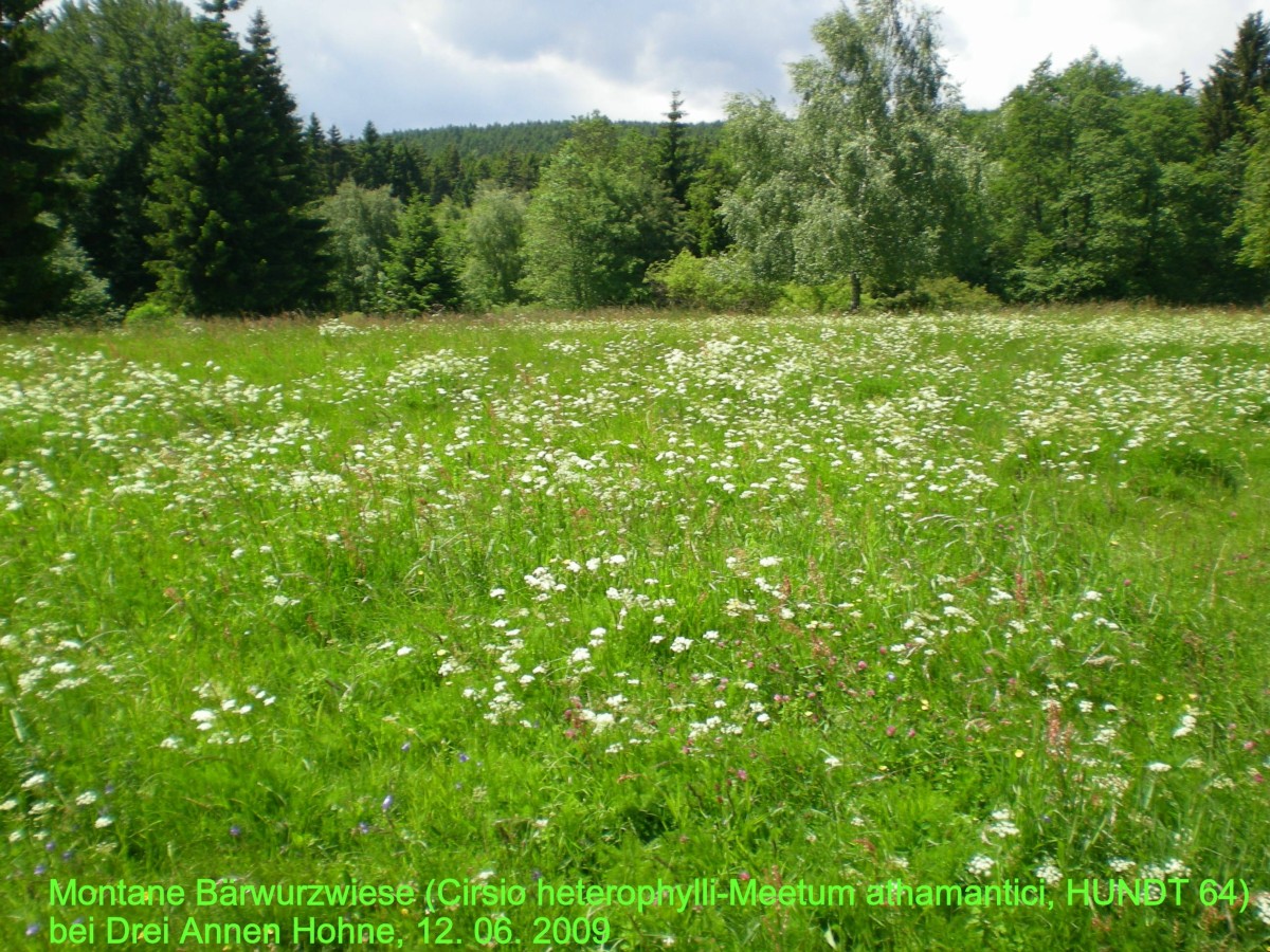Der Löwenzahnpfad bei Drei Annen Hohne Oberhalb des Bahnhofs Drei Annen Hohne führt der sog. Löwenzahnpfad zur Hohnewiese. Dieser für die Umwelterziehung außerordentlich bedeutsame Naturlehrpfad, die Idee kam vom ZDF, fügt sich in eine ganze Reihe von Erlebniszentren ein, womit Mitarbeiter des Nationalparks an die Öffentlichkeit treten. Luchs- und Auerhuhngehege, Wildnis- und Borkenkäferlehrpfad sowie die verschiedensten Nationalparkinformationsstellen, darunter das hier in der Nähe gelegene Natur-Erlebniszentrum Hohnehof, wurden geschaffen und werden von Besuchern gern genutzt. Neben den einzelnen, besonders auch für Kinder und Jugendliche interessanten Info- Punkten des Löwenzahnpfads, wie Tierspuren- und Barfußpfad, Sprunggrube mit den angegebenen Weiten, die Tiere springen können, Höreule oder der "uralten" Eiche fällt der Blick auf die reich blühende Bergwiese. Es ist ein Ökosystem, das man in unserer heutigen Kulturlandschaft nur noch selten antrifft. Wie alle anderen Offenlandbiotope, genannt seien hier vor allem Trockenrasen und Heiden, bedürfen auch Wiesen einer ständigen Pflege, in diesem Fall der Mahd. Zweimal im Jahr, im Juni zur Heuernte und im Spätsommer zur sog. Grummeternte hatten Landwirte in vergangener Zeit diese Wiesen gemäht. Standen im Juni die Gräser im Vordergrund, so waren es Ende August die vielen bunt blühenden Kräuter, die den Aspekt bestimmten. Diese Art landwirtschaftlicher Nutzung gibt es heute nicht mehr, vielmehr bestimmen intensive Düngung und mehrmaliger Schnitt unter Einsatz leistungsstarken Maschinen das Geschehen. Auch die intensive Beweidung, zumeist mit großen Rinder-Herden, gehört dazu. Sie ist aber leider mit der früheren, schonenden, extensiven Beweidung nicht zu vergleichen. So lassen sich diese artenreichen und von uns ob ihrer Blütenpracht bewunderten Ökosyseme nur durch Bewirtschaftungsmaßnahmen erhalten, die der alten o. g. landwirtschaftlichen Kultur entsprechen. Wieder einmal ist der Naturschutz mit seinen fleißigen, ehrenamtlichen Helfern, aber auch eine unter bestimmten Umständen notwendige und wünschenswerte, auf die Ziele des Naturschutzes ausgerichtete Kooperation mit landwirtschaftlichen Betrieben, gefragt. Die hier betrachtete Hohnewiese, aber auch andere Orte im Harz, wie bspw. das Naturschutzgebiet "Bergwiesengesellschaften bei Hohegeiß" sind Orte dieses Geschehens.